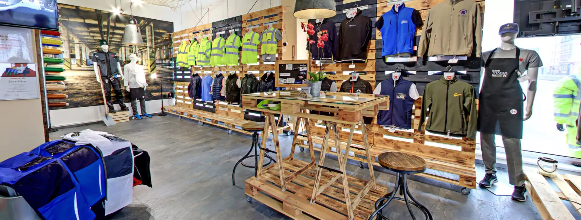 In unserem Showroom in Mannheim finden Sie hochwertige und funktionale Arbeitskleidung bestickt mit Ihrem Logo für die Bereiche Handwerk, Medizin, Pflege, Gastronomie und viele mehr.